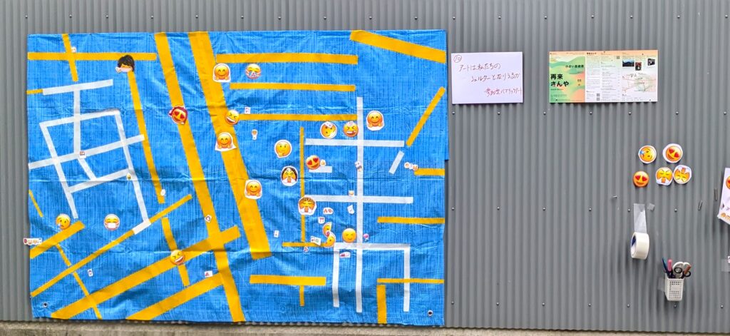 そこで、その場にある環境を活かし、神社のトタン壁を利用して公共芸術のコラージュを行いました。安いブルーシートや手でちぎれるテープは、地元のおじさんたちが日常的に座ったり荷物を覆ったりするのに愛用している身近な素材です。