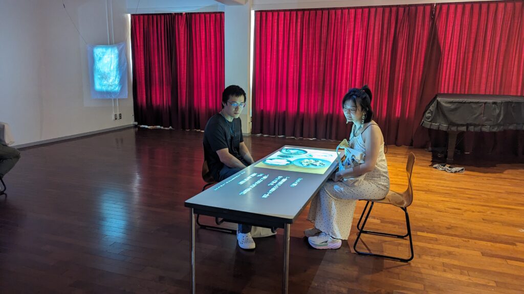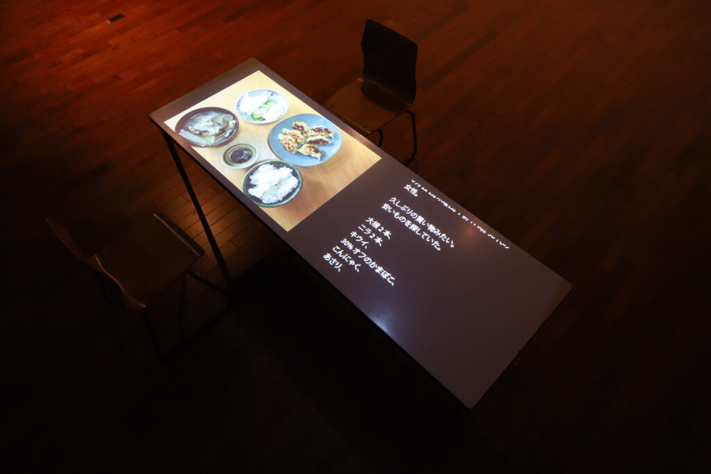 映像作品(8分43秒)は、7回分の夕食の写真に、私が料理日記を朗読したモノローグを合わせたものです。展示空間では、夕食の映像が投影されたテーブルの前に、鑑賞者が向かい合って2名まで座ることができます。まるで、誰かの(あるいは自分自身の)一人の夕食と対峙するかのように。
